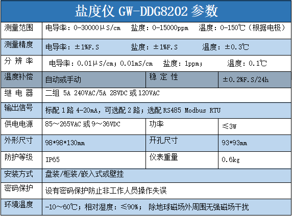 名称:工业在线盐度仪海水养殖高精度测盐仪器电导率盐度计GW-DDG8202