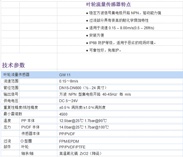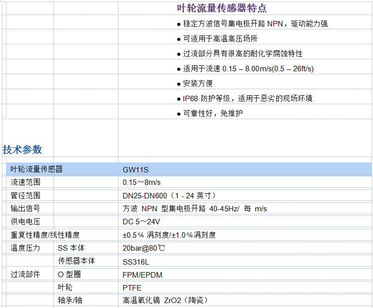 GW11 系列叶轮流量传感器采用高精度霍尔传感器保证了稳定的脉冲信号输出,