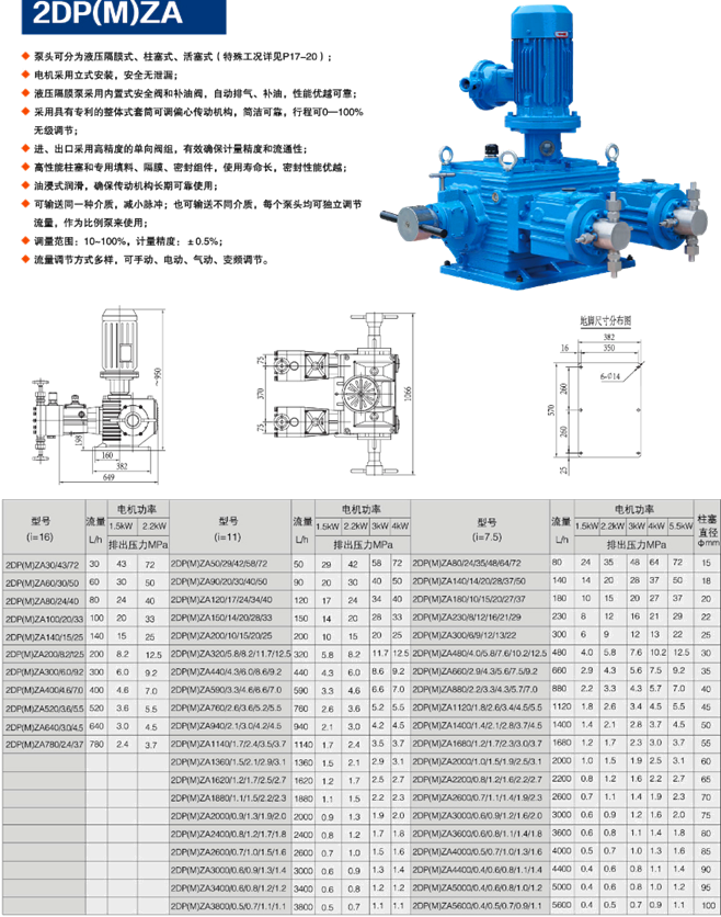DP(M)ZA系列: 柱塞式计量泵和液压隔膜式计量泵外形及安装尺寸一致,其内部结构和泵头不一样,具体选型请详细了解“产品型号”如"DPMWA"指液压隔膜式计量泵,"DPWA"指柱塞式计量泵.