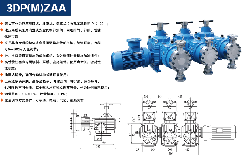 3DP(M)ZAA系列: 柱塞式计量泵和液压隔膜式计量泵外形及安装尺寸一致,其内部结构和泵头不一样,具体选型请详细了解“产品型号”如"DPMWA"指液压隔膜式计量泵,"DPWA"指柱塞式计量泵.