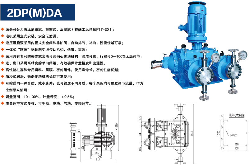 2DP(M)DA系列: 柱塞式计量泵和液压隔膜式计量泵外形及安装尺寸一致,其内部结构和泵头不一样,具体选型请详细了解“产品型号”如"DPMWA"指液压隔膜式计量泵,"DPWA"指柱塞式计量泵.