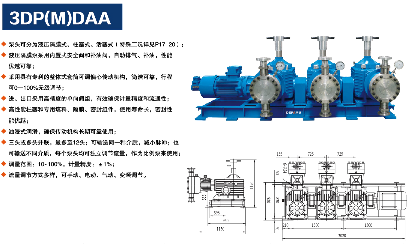 3DP(M)DAA系列: 柱塞式计量泵和液压隔膜式计量泵外形及安装尺寸一致,其内部结构和泵头不一样,具体选型请详细了解“产品型号”如"DPMWA"指液压隔膜式计量泵,"DPWA"指柱塞式计量泵.