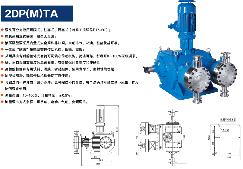 2DP(M)TA系列: 柱塞式计量泵和液压隔膜式计量泵外形及安装尺寸一致,其内部结构和泵头不一样,具体选型请详细了解“产品型号”如"DPMWA"指液压隔膜式计量泵,"DPWA"指柱塞式计量泵.
