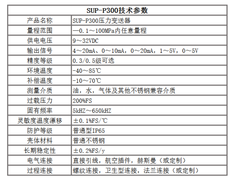 SUP-P300系列压力变送器压力敏感核心采用了高性能的硅压阻式压力充油芯体,内部的专